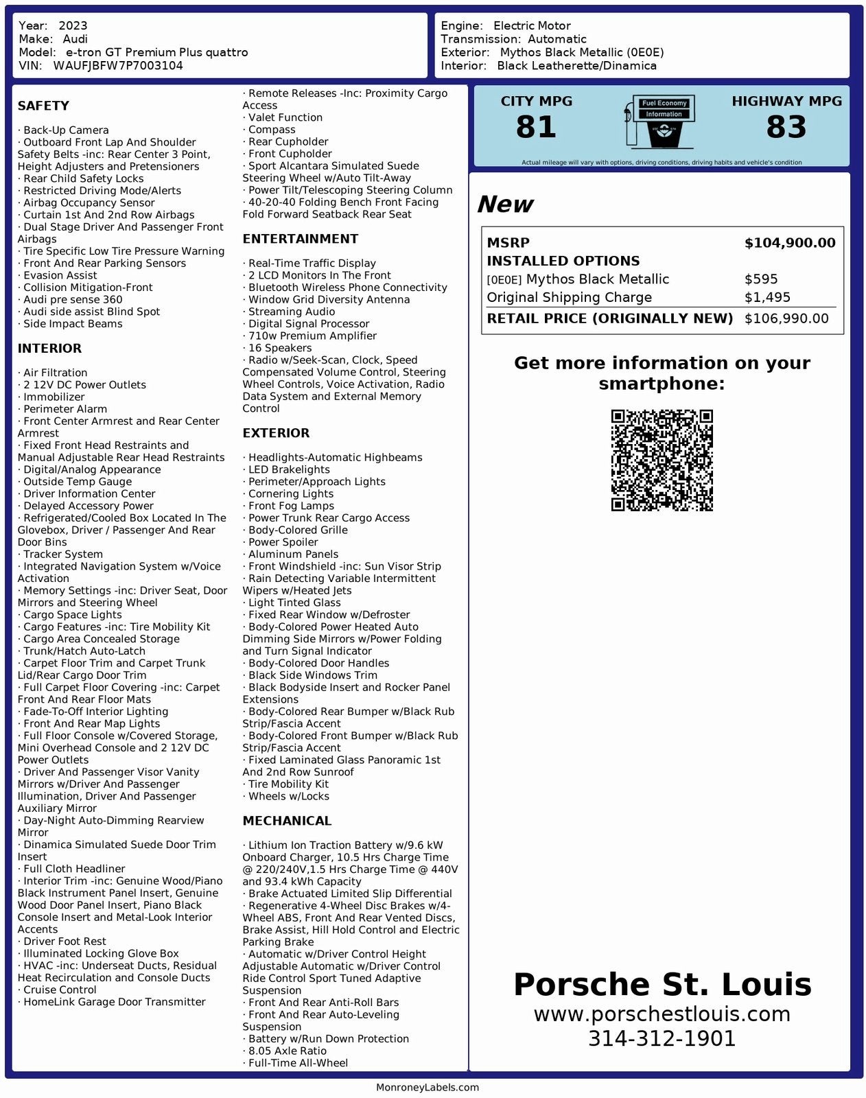 This 2023 Audi e-tron GT Premium Plus quattro represents the pinnacle of electric performance and modern luxury, available now at Porsche St. Louis. This vehicle has been fully inspected and is ready for its next owner.